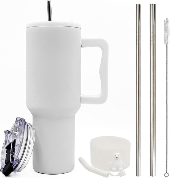 Tasse à café à emporter 1200 ml 40 oz, tasse isolante sous vide à double paroi en acier inoxydable avec poignée et paille, tasse de voiture, tasse thermique, tasse à café pour boissons chaudes et froides, 05 blanc