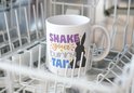 Cette tasse en céramique blanche comporte le texte « ShakeYourBunnyTail » et est imprimée avec des encres écologiques durables qui sont sans danger pour une utilisation à haute température, ce qui rend ce produit résistant au micro-ondes et au lave-vaisselle.