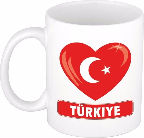 Tasse / tasse de dinde de coeur. Ce mug avec le drapeau turc en forme de cœur, a une contenance d'environ 300 ml. La tasse va au micro-ondes et au lave-vaisselle. Matière: céramique. Hauteur : 9,5 cm. Diamètre : 8,2 cm.