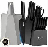 Le bloc à couteaux de Jamie Oliver et Tefal est d'une taille pratique. En plus de la taille pratique, les formes rondes du bloc sont très modernes. La couleur du bois est agréable et sombre, ce qui lui donne un aspect chic. Ce qui est très sympa, c'est que le bloc contient des autocollants antidérapants pour que le plan de travail ne soit pas endommagé. Les couteaux tiennent bien en main grâce à une bonne prise en main. Après utilisation, vous pouvez facilement remettre les couteaux dans le bloc. L'ensemble de couteaux comprend 1 couteau dentelé. Un couteau dentelé plus petit aurait été bien pour moi, mais certainement pas insurmontable. Les fentes où se trouvent les couteaux traversent tout le bloc, ce qui signifie que la saleté est moins susceptible de rester dans le bloc. D'un point de vue hygiénique, c'est pour moi un gros plus pour ce set de couteaux. Dans l'ensemble, je suis très satisfait. Le bloc se situe entièrement dans la cuisine et est agréable à utiliser.