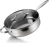 Tefal par Jamie Oliver Prima Casserole 26 cm avec couvercle - La Pan est vraiment parfaite. Assez lourd mais bon à utiliser. Un atout pour notre cuisine. CONSEILLÉ. Après que la famille soit venue dîner une semaine plus tard, j’ai effectivement utilisé ma nouvelle poêle. pour une préparation culinaire approfondie. Tout le monde était très enthousiaste et après avoir étudié et posé des questions sur la nouvelle poêle, je leur ai parlé de sa commodité et du fait que j'achèterais une poêle similaire à l'avenir. Les instructions d’utilisation qui l’accompagnent sont également claires. Si j'allume la poêle sans beurre, cela prend très peu de temps, le point rouge central s'est décoloré et je peux alors immédiatement commencer à ajouter du beurre. Il est vraiment conseillé de laisser d'abord refroidir la poêle puis de la laver. Je ne l'ai pas lavé au lave-vaisselle mais à la main. L'anti-approche est très bon et c'est pour cela que j'essaie de l'utiliser avec une cuillère en bois et un bon nettoyage manuel. Le design est vraiment moderne.