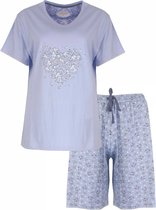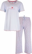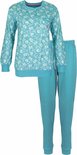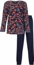 Pyjama femme Tenderness en 100% coton peigné. Ce pyjama est confectionné dans une qualité de jersey portable et extensible. Le haut est imprimé d'un motif floral romantique. Le col rond a une fermeture polo avec des boutons, le col est terminé par un point festonné. Poche poitrine avec nœud en satin. Manches longues avec poignets et ourlet côtelés. Le pantalon long union a un cordon de serrage à la taille et des revers aux chevilles. Poignets en élasthanne pour un confort accru.