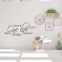 Ce sticker mural comporte le texte «Une vie: affrontez-la, vivez-la, ressentez-la, aimez-la, profitez-en» et constitue un atout précieux pour votre maison. Cela vous rappellera quotidiennement que vous n'avez qu'une chance de bien vivre. Pour cette raison, essayez de tirer le meilleur parti de votre vie. Placer un autocollant mural peut vous assurer que la pièce est dotée d'un beau nouveau look en quelques minutes. Vous pouvez commander l'autocollant mural en différentes couleurs et tailles afin que l'autocollant s'intègre bien au reste de votre maison. C'est agréable à obtenir pour vous-même, mais c'est aussi très agréable de donner cet autocollant mural en cadeau.