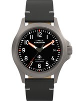 Montre Timex Weekender Vintage avec un bracelet marron et un cadran noir.