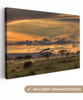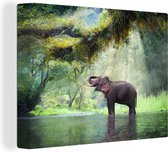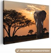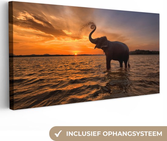 Un éléphant debout dans l'eau au coucher du soleil. Une image qui rayonne de confort et de tranquillité. Avec cette toile, vous créez le salon, la chambre ou le bureau parfait !