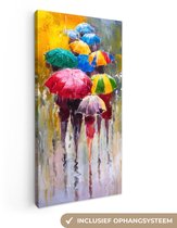 Une peinture d'une femme avec un parapluie, traversant un passage clouté. Les voitures peuvent être vues en arrière-plan.
