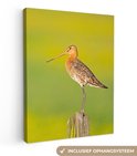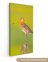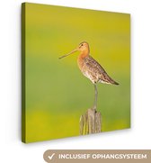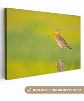 Enrichissez votre intérieur avec cette toile ! La peinture sur toile montre une barge à queue noire sur un poteau en bois. L'oiseau se dresse sur un fond vert.