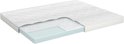 En combinaison avec la faible contre-pression, un effet de réduction de la pression (anti-escarres) est obtenu, ce qui signifie que cette mousse froide est également régulièrement utilisée dans les hôtels. La mousse froide est produite en mousse et a un HR 50 et se compose d'environ 9 cm d'épaisseur de noyau. HR / SG signifie poids spécifique, c'est le nombre de kilogrammes de matériau traité dans le matelas par mètre cube (kg/m3). Plus la densité est élevée, meilleures sont la qualité, la résilience et la durabilité.