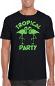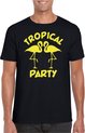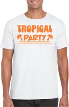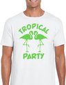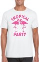 T-shirt de party Tropical pour homme en blanc. Cette chemise tropicale est imprimée du texte : Tropical Party et deux flamants roses. L'imprimé est en paillettes de couleur orange. Vous organisez bientôt une soirée à thème tropical/Hawaï ? Alors cette chemise est indispensable ! La chemise est également agréable à offrir ou à porter lors d'une sortie ou pendant le carnaval. Matériel: 145 grammes, 100% coton. Merk: Bellatio Decorations.