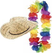 Ensemble de costumes de carnaval pour une party tropicale à Hawaï, composé d'un chapeau de paille de style plage en beige et d'une guirlande/couronne de fleurs pleines en violet. Pour hommes et femmes. Vous vous démarquerez certainement de manière positive avec cet ensemble de vêtements de fête coloré. Déguisements les accessoires de costumes. Thema : party Tropical , Hawaï, Summer Vibes, Vie à la plage, Toppers, BBQ. Ajoutez uniquement des vêtements légers et de jolis bijoux pour un résultat optimal.