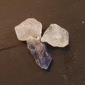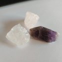 Dans le sac (quelques différences de couleur) se trouvent :Cristal de roche, Quartz rose et (Chevron) Améthyste.