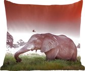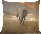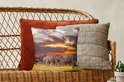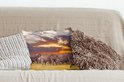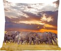 Un troupeau d'éléphants se rassemble et se prépare pour la nuit. Au loin, le soleil se couche et laisse une lueur orange.Également disponible comme coussin décoratif extérieur