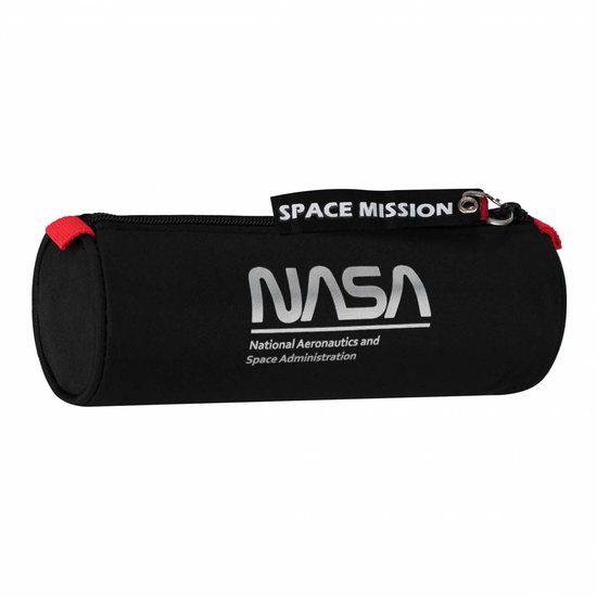 Trousse à crayons Zwart en forme de tube avec logo NASA et imprimé spatial. Dimensions : 22 x 8 centimètres.