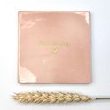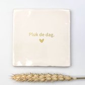 Avec les différents textes présents sur nos carreaux, ils constituent un cadeau idéal pour toute occasion. Nos carreaux ont une taille de 10x10 cm et sont disponibles en blanc cassé, vert ou rose poudré. Pour l'impression des textes, nous utilisons un sérigraphe qui, avec beaucoup d'amour pour son métier, imprime les textes en or métallisé sur les carreaux.