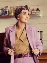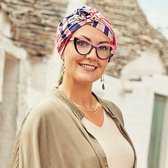 Un turban tendance et élégant très facile à enfiler et à coiffer. Le turban Shakti est un magnifique turban avec un bandeau semi-attaché, qui peut être coiffé de nombreuses façons et crée beaucoup de volume sur votre tête. Utilisez le bandeau pour faire un nœud ou un chignon sur le devant. Ce turban Shakti est fabriqué à partir de la matière la plus délicate en viscose de Bamboo Caretech®, incroyablement douce et soyeuse. Le Bamboe est non seulement un matériau confortable et extensible, mais il est également connu pour être respirant, thermorégulateur et plus absorbant l'humidité que le coton. Ce magnifique imprimé s’appelle Golden Sunlit et ressemble à une petite oasis tropicale d’optimisme. L'imprimé chaud de couleur dorée avec ses petites gerbes de fleurs gaies, dans une teinte rouge brûlé, rappelle la lumière du soleil du sud, les plages de sable scintillantes et la peau tachetée de rousseur. Ces couleurs donnent de la chaleur et de la vie à votre visage et peuvent être combinées aussi bien avec des couleurs chaudes que froides. Remarque : nous l'avons un peu pimenté avec un bandeau bicolore rouge uni et un tissu chic à paillettes dorées. Composition 95% Viscose (Bamboe), 5% Spandex
