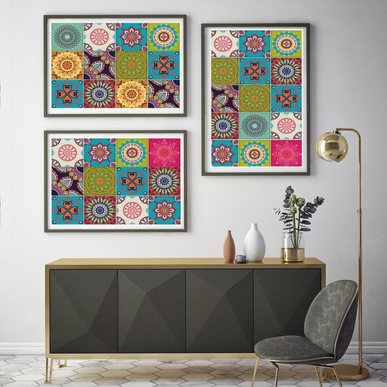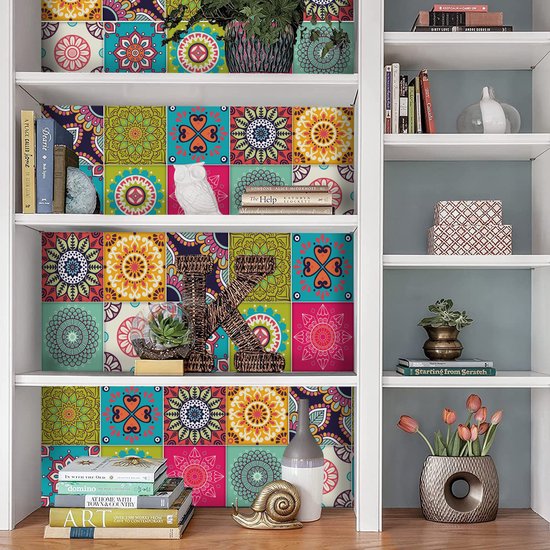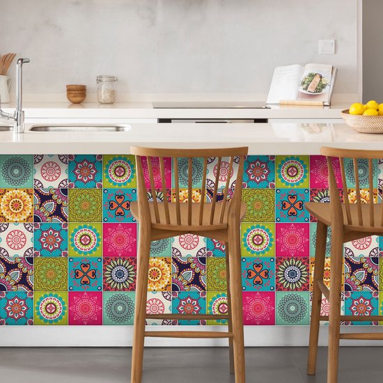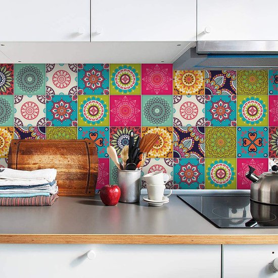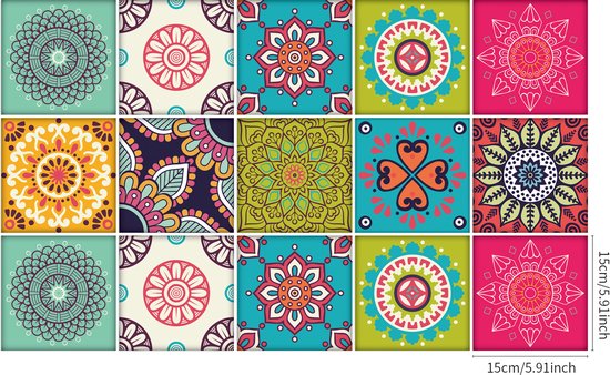 Ulticool Décoration Stickers carrelages - Mandala Vert Beige Blauw Vert Clair Rose - Cuisine cm - 15 pièces