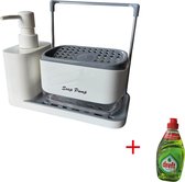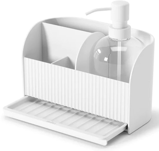 Découvrez l'utilité de cet organiseur d'évier avec bouteille pompe à savon amovible et bac de récupération d'eau qui sert d'espace de rangement supplémentaire et d'évacuation de l'eau. Grâce au séparateur amovible, vous pouvez choisir vous-même la disposition de vos brosses et éponges à vaisselle. Ce contenant tout-en-un offre la solution idéale pour un comptoir de cuisine organisé. Ce contenant multifonctionnel, composé à 88 % de plastique recyclé, offre non seulement une apparence soignée mais contribue également à un mode de vie plus durable. Conçu dans une couleur blanc vif, cet organisateur est livré avec une bouteille pompe à savon amovible pratique de 500 ml et un bac de récupération d'eau. Le récipient facilite non seulement l'évacuation de l'eau, mais offre également un espace de stockage supplémentaire. Ajoutez à cela le séparateur amovible, qui peut être positionné de deux manières pour organiser de manière optimale les brosses à vaisselle et autres articles, et vous obtenez une solution tout-en-un pour une cuisine bien rangée. Les dimensions sont 17 cm de largeur, 21 cm de profondeur et 18 cm de hauteur. Organisateur peu encombrant d' Umbra Cet organisateur d'évier de la célèbre marque Umbra