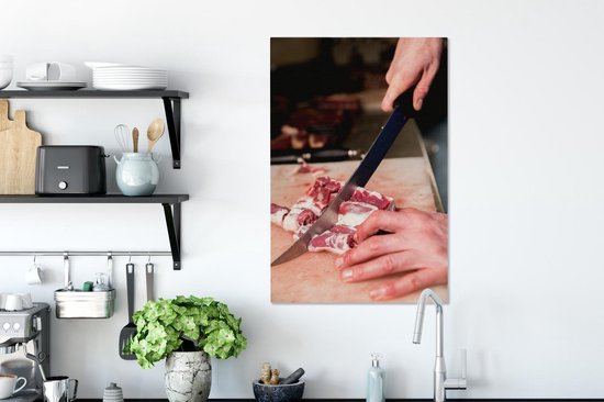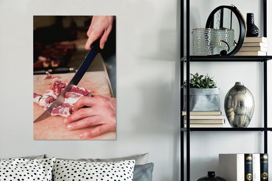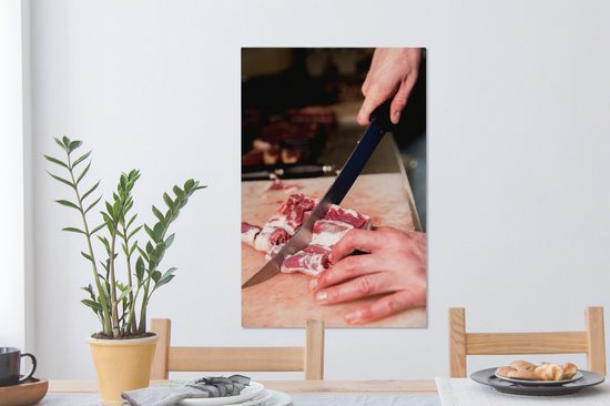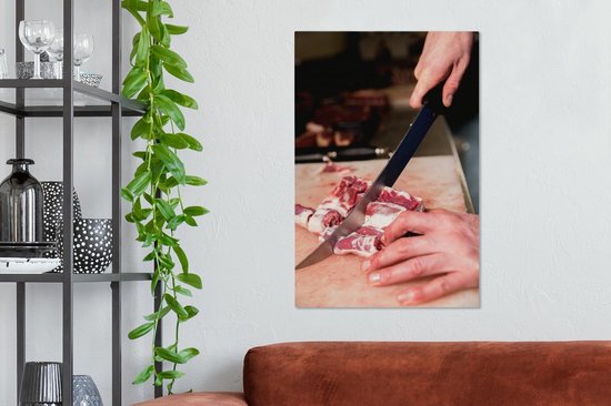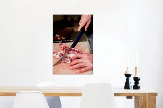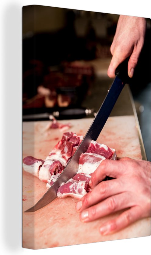 Un boucher coupe la viande au couteau toile 40x60 cm - Tirage photo sur toile (Décoration murale salon / chambre)