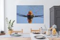 Un canard à crête rouge nage dans une toile de lac bleu 140x90 cm - Tirage photo sur toile (Décoration murale salon / chambre)