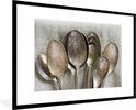 Une collection de cuillères rouillées et antiques de tailles variées. Ces cuillères sont placées sur une toile de lin lisse 90x60 cm