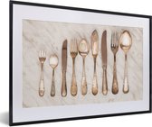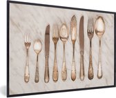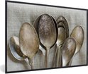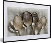 Une collection de cuillères rouillées et antiques de tailles variées. Ces cuillères sont placées sur une toile de lin uniforme 60x40 cm
