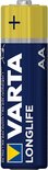 Varta Longlife AA LR6. Type de batterie: Batterie à usage unique, Taille(s) de la batterie: AA, Technologie batterie: Alcaline. Hauteur: 50,5 mm, Diamètre: 1,45 cm, Poids: 23,2 g. Facteur de forme de la batterie: Cylindrique