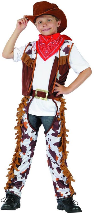 Cette tenue de cow-boy pour enfant comprend un cardigan, un sur-pantalon, un chapeau et une écharpe. Remarque: T-shirt, jeans et chaussures ne sont pas inclus. Le cardigan est marron. Celui-ci est orné de franges sur la poitrine pour un bel effet. Une étoile argentée est imprimée sur le devant pour une belle finition. Le sur-pantalon est facile à mettre par-dessus d'autres pantalons. Ceci est attaché au moyen d'une ceinture avec une fausse boucle (attachée avec du velcro). Ce pantalon est imprimé de taches pour un vrai style cowboy. Le foulard rouge est imprimé de motifs blancs. C'est facile à nouer autour de votre cou. Le chapeau de cowboy typique est marron. Cela fournit une tenue complète. Ce costume de cow-boy pour enfant est idéal pour le carnaval ou une soirée déguisée.