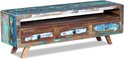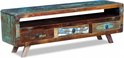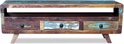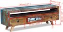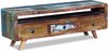 Ce meuble TV est en bois massif recyclé, ce qui signifie que chaque meuble est complètement unique et légèrement différent du reste. Les meubles fabriqués à partir de bois recyclé présentent les caractéristiques de différents types de bois, tels que le sheesham, le teck, le palissandre, le manguier et l'acacia. Le bois recyclé est solide, stable, durable et beau. Les signes d'usure et la structure visible des veines du bois donnent à chaque meuble un morceau d'histoire et un aspect unique.