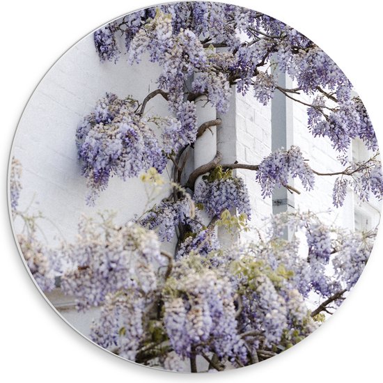 WallClassics - Cercle mural en panneau de mousse PVC - Fleurs de glycine contre le mur - Photo 30x30 cm sur cercle mural (avec système d'accrochage)