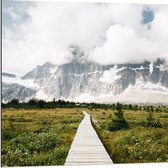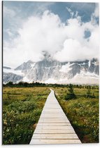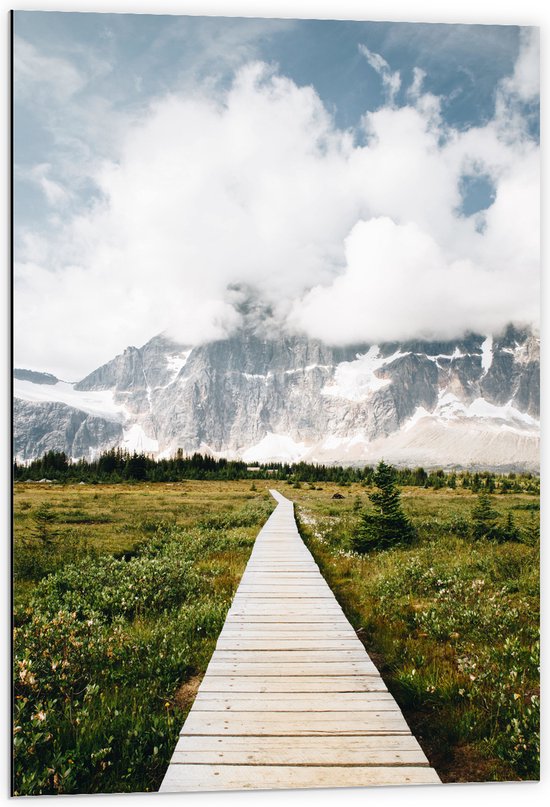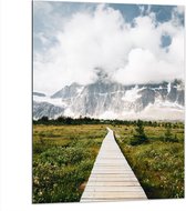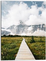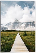 WallClassics - Dibond - Chemin de bois vers les Montagnes - Photo sur aluminium 60x90 cm (avec système de suspension)