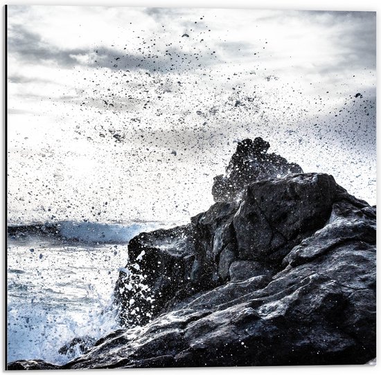WallClassics - Dibond - Éclaboussures Water sur rocher en Zwart et Wit - Photo 50x50 cm sur aluminium (Décoration murale en métal)