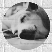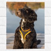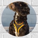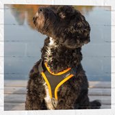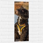 WallClassics - Muursticker Cercle - Chien noir avec bande jaune sur échafaudage - 30x30 cm Photo sur Muursticker