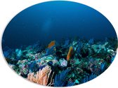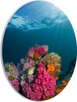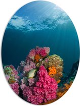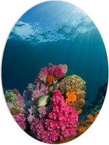 WallClassics - Panneau de mousse PVC ovale - Rayons de soleil sur corail sur le fond marin - 72x96 cm Photo sur ovale (avec système de suspension)