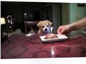 WallClassics - Panneau en mousse PVC - Anniversaire Klein chien assis sur une chaise à la table à manger - Photo 105x70 cm sur panneau en mousse PVC (avec système de suspension)