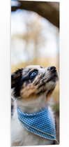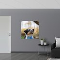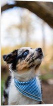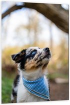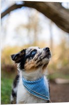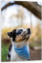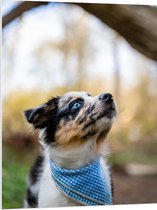 WallClassics - Panneau en mousse PVC – Puppy regardant vers le haut avec des yeux bleu vif dans la forêt – Photo 100 x 100 cm sur panneau en mousse PVC
