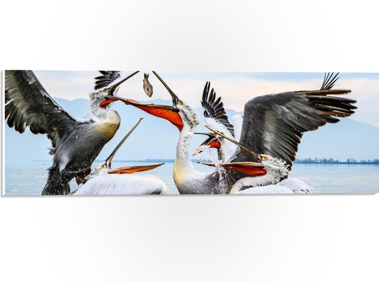 WallClassics - Plaque de Mousse PVC - Pélicans se Battant pour un Poisson - Photo 60x20 cm sur Plaque de Mousse PVC