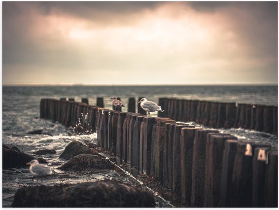 WallClassics - Poster brillant – Mouettes sur poteaux en bois au bord de la mer - Photo 80x60 cm sur papier poster brillant