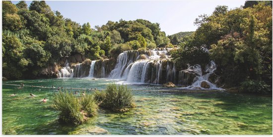 WallClassics - Poster brillant - Personnes nageant à une cascade - 100 x 50 cm Photo sur papier poster avec finition brillante