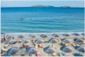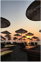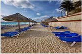 WallClassics - Poster Glossy - Parasols au toit de chaume avec transats sur la plage - 75x50 cm Photo sur Papier Poster avec Finition Brillante
