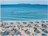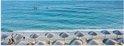 WallClassics - Poster Glossy - Parasols au toit de chaume avec transats sur la plage - Photo 60x20 cm sur papier poster avec finition brillante