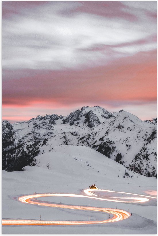 WallClassics - Poster (Matte) - Route illuminée à travers un paysage enneigé - 60x90 cm Photo sur papier affiche avec un aspect mat