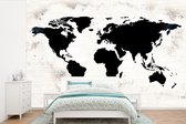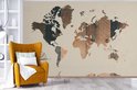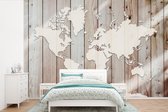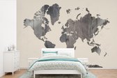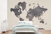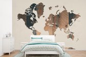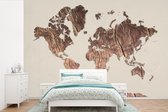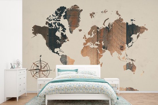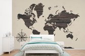 Wereldkaart du bois foncé avec une rose des vents sur fond rose | Wereldkaart en bois 390x260 cm