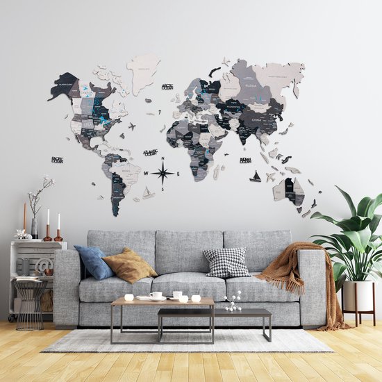 Wereldkaart en bois 3D - Grijs - XXL (300 x 170 cm)
