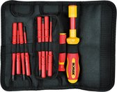 Wiha einstellbar Momentschroevendraaier VDE 2 - 7 Nm DIN EN 60900, DIN EN ISO 6789, DIN EN 26789Het volledig gecertificeerde TorqueVario-S VDE-koppelsysteem biedt een beheerst aandraaien van de schroeven en tegelijkertijd veiligheid bij elektrische toepassingen. De gereedschapsset bevat een ergonomisch gevormde koppelschroevendraaier met geïntegreerde numerieke schaal, een bithouder en het instelgereedschap. Alle componenten zijn praktisch en overzichtelijk geordend in een hoogwaardige en stevige etui. De koppelschroevendraaier VDE is met het variabel instelbare koppelbereik van 2,0 - 7,0 Nm geschikt voor veel toepassingen. Door een duidelijk hoor- en voelbaar signaal bij het uitoefenen van het aanhaalmoment wordt een procesveilige aanhaalmomentmechaniek gewaarborgd die tegen materiaalbeschadigingen en nabewerking beschermt. Met een nauwkeurigheid van +/- 6% voldoet het momentgereedschap aan de eisen van DIN EN ISO 6789. De geïsoleerde ClicFix bithouder zorgt door een mechanische schachtvergrendeling voor een veilige bevestiging van de 75 mm lange slimBits. Zowel de momentschroevendraaier als de slimBits worden conform de internationale norm IEC 60900 per stuk gecontroleerd en maken het mogelijk veilig te werken aan onder spanning staande onderdelen tot 1000 V AC.Afmetingen (handgreep): 41 x 142 mmVoldoet aan uw eisen: variabel instelbaar draaimoment dekt groot toepassingsgebied. Verhoogt uw efficiëntie: het juiste aanhaalmoment beschermt u tegen beschadigingen van het materiaal en nabewerking. Ontziet uw gezondheid: met gepatenteerd SoftFinish-handvatdesign voor werken waarbij handen en spieren worden ontzien. Door artsen en therapeuten van de AGR (Duitse vereniging 'Actie Gezonde Rug') aanbevolen! Biedt u volledige bescherming: ieder gereedschap afzonderlijk bij 10.000 V AC getest en goedgekeurd voor 1000 V AC. Toepassing: om gecontroleerd schroeven aan te brengen in de buurt van spanningsgeleidende onderdelen tot 1000 V AC. Extra: incl. fabriekstestcertificaat. Normen: gecertificeerd conform IEC 60900. DIN EN ISO 6789.'s Werelds enige VDE-momentschroevendraaier · Gecontroleerd aandraaien van elektrische schroefverbindingen met slim-bits · Onbeperkte toegankelijkheid door slim-technologie · VDE- en GS-keurmerkMomentschroevendraaier TorqueVario-S electric variabel instelbare koppelbegrenzing 2 - 7 (26627)
