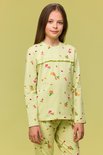 Pyjama Woody pour bébé, fille et femme en coton extensible et souple vert clair, avec un imprimé intégral de nos drôles de canards Woody . Le pull est égayé par un volant décoratif frivole sur le devant. Il s'agit d'un modèle plutôt ajusté, avec des manches longues et un pantalon long, mais qui est agréablement doux et agréable à porter grâce au coton stretch. Mon préféré. Des boutons pression sont prévus jusqu'à la taille 8 ans pour faciliter l'habillage et le déshabillage.