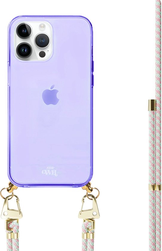 xoxo Wildhearts Étui en silicone avec cordon - Étui de téléphone violet avec cordon - Chaîne de téléphone - Aqua Pink - Cord Case - convient pour Apple iPhone 12 Pro - Cordon rayé bleu clair / rose