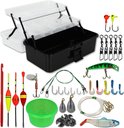 L'ensemble comprend une large gamme d'accessoires, notamment des hameçons, des twisters, des émerillons, une grenaille de plomb, une ligne monofilament avec des hameçons de différentes tailles, des flotteurs, une tête plombée, un plomb, une cuillère, un bas de ligne, une boîte à appâts, un déclencheur d'hameçon, un wobbler et une pêche en caoutchouc. Cette sélection rigoureuse d'accessoires permet aux pêcheurs de réagir avec flexibilité aux différentes conditions de pêche et espèces de poissons.