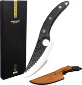 Forgé à la main et usiné, la technique de fabrication japonaise traditionnelle connue des épées de samouraï japonais de plus de 800 ans. Chaque face est recouverte de 18 couches d'acier inoxydable plié. Belle poignée en Canvas-Micarta noir chiné, attachée par 2 rivets en acier inoxydable et embouts avec caractères japonais gravés.