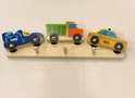 Joli Yourshop24 pour enfants de Yourshop24 pour la chambre des enfants et / ou bébé. Ce cintre de voiture est en bois et dispose de 3 crochets. Au-dessus des supports se trouvent une voiture de course, un camion et un taxi.