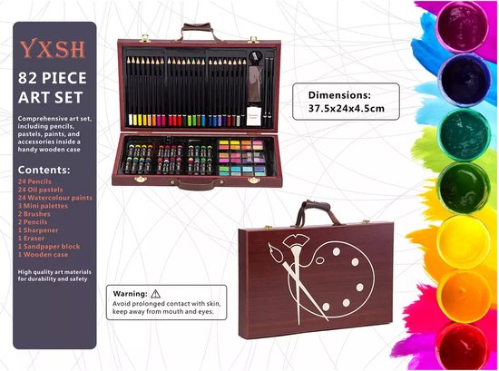 Un ensemble d'art de grande valeur, contient une large sélection de matériaux d'art de haute qualité, y compris des crayons, des pastels, des peintures et des accessoires dans une boîte en bois pratique, cadeau parfait pour tout artiste en herbe. Taille de l'article fini L37,5, W24, H4,5 cm.